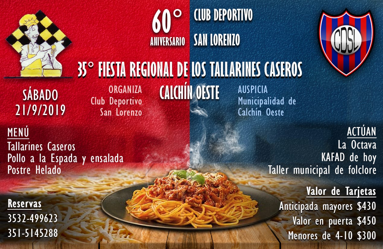 Además de festejarse la 35° edición de la Fiesta Regional de los Tallarines Caseros se cumplen 60 años del Club deportivo San Lorenzo. La primavera llega a Calchín Oeste con varios festejos, se presentará el baile con la Octava, Kafad de hoy y el ballet municipal de folklore.