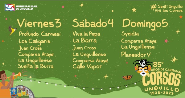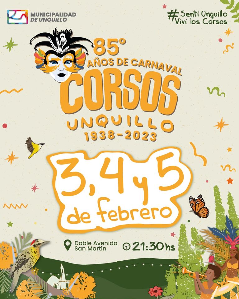 Se realizará una nueva edición de los tradicionales Corsos de Unquillo en la provincia de Córdoba. El encuentro se llevará a cabo los días 3, 4 y 5 de febrero desde las 21:30hs en la Doble Avenida San Martín.