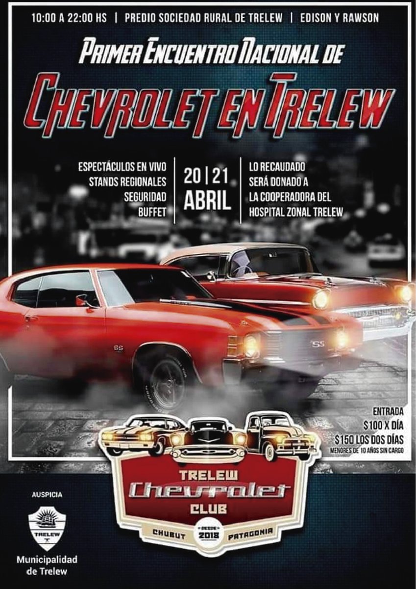 1° Encuentro Nacional de Chevrolet en Trelew. Se realizará el el sábado 20 y domingo 21 de Abril. El evento sera a beneficio de la Cooperadora del Hospital Zonal Trelew.