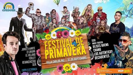 ESTE AÑO, LA FIESTA DE LA PRIMAVERA EN CARLOS PAZ SE DESARROLLARÁ EL VIERNES 21 DE SEPTIEMBRE CON LA PRESENTACIÓN DE LOS AUTÉNTICOS DECADENTES, QUIENES CONTARÁN CON LA PARTICIPACIÓN COMO INVITADO ESPECIAL DE ROLO SARTORIO (LÍDER DEL GRUPO LA BERISO). ADEMÁS SE PRESENTARÁN CHANO Y UNO DE LOS ARTISTAS MÁS DESTACADOS DE CÓRDOBA, ULISES BUENO, A LOS QUE SE LE SUMARÁN UNA DESTACADA GRILLA DE NÚMEROS ARTÍSTICOS.