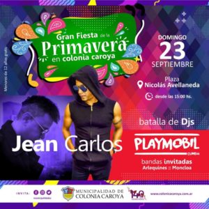 EL DOMINGO 23 DE SEPTIEMBRE COLONIA CAROYA SERÁ UNA FIESTA PARA RECIBIR EL COMIENZO DE LA ESTACIÓN MÁS ESPERADA Y EL DÍA DEL ESTUDIANTE. SERÁ UN ENCUENTRO PENSADO PARA TODA LA FAMILIA DONDE HABRÁ BATALLA DE DJ´S, ACTUARÁN ARLEQUINES Y MONCLOA CUMBIA EN LA PRIMERA PARTE Y LUEGO SUBIRÁN AL ESCENARIO PLAYMÓBIL Y DESDE LAS 20:30 EL SHOW EN VIVO DE JEAN CARLOS. NO SE VENDERÁ ALCOHOL NI EN EL PREDIO NI EN LOS COMERCIOS CERCANO. LAS PUERTAS SE ABRIRÁN A LAS 15 Y LA FIESTA COMENZARÁ A LAS 16 HS.