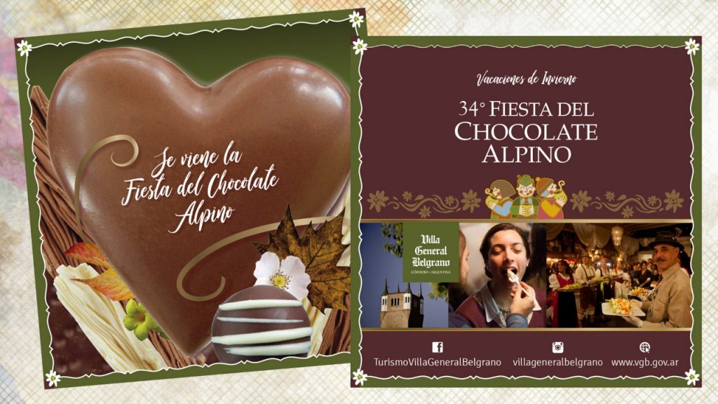 Durante las vacaciones de invierno, del 7 al 29 de Julio, Villa General Belgrano realizará la 34º Fiesta del Chocolate Alpino, que tendrá lugar en un renovado Salón de Eventos y Convenciones. El Pueblo se llena de aroma típico a chocolate caliente, inspiración de los inmigrantes de Suiza, Austria, Alemania e Italia. El Salón Alpino recibe la alegría de la música y la danza de diversas colectividades.