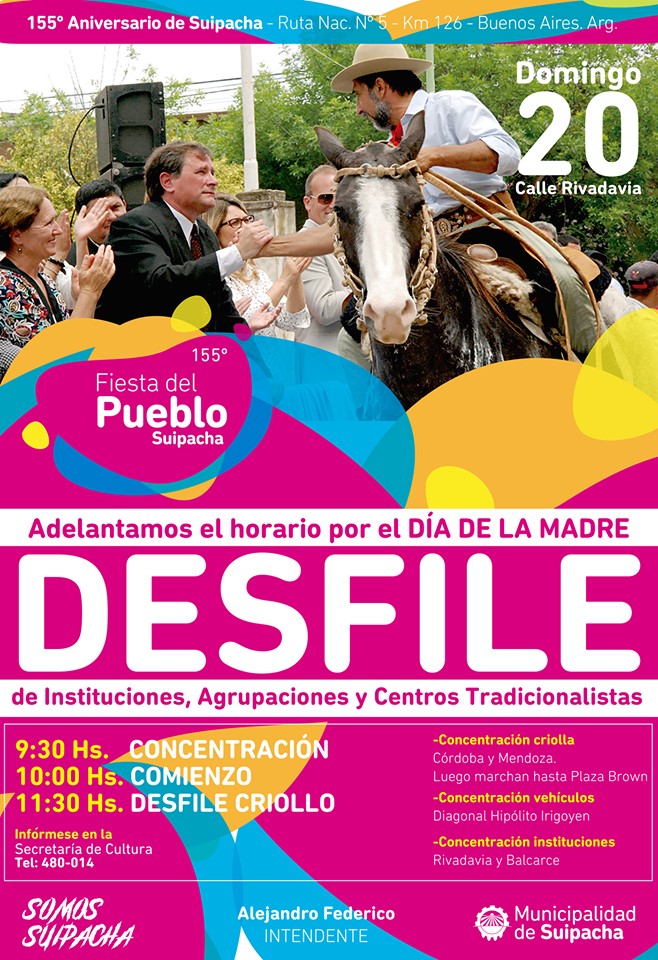 Por coincidir nuestros festejos de 155 aniversario del Partido con el DÍA DE LA MADRE, adelantamos el horario del DESFILE DE INSTITUCIONES, AGRUPACIONES Y CENTROS TRADICIONALISTAS.