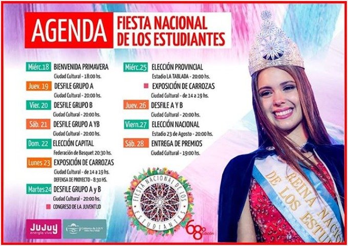 Este miércoles 18 comienzan las actividades con el desfile “Bienvenida primavera” en ciudad cultural. Luego continuarán a lo largo de diez días, teniendo como fechas destacadas la Elección Reina “Capital” (por el departamento Dr. Manuel Belgrano) el 22 de septiembre; la Elección Provincial el 25 en el Estadio La Tablada; la Elección Nacional el 27 en el estadio 23 de Agosto; y la entrega de premios el sábado 28 en Ciudad Cultural.