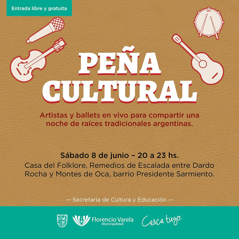 ProvinciasBuenos AiresEventosFechasLocales GRAN PEÑA CULTURAL EN FLORENCIO VARELA FacebookTwitterPinterestWhatsApp En la casa del Folclore se realizara la Gran Peña Cultura donde estarán presentes ballet y artistas para compartir una noche de las raíces argentinas. Este sábado 8 de 20 a 23hs. Invita secretaria de cultura y educación Comparte esto:Haz clic para enviar un enlace por correo electrónico a un amigo (Se abre en una ventana nueva)Haz clic para imprimir (Se abre en una ventana nueva)