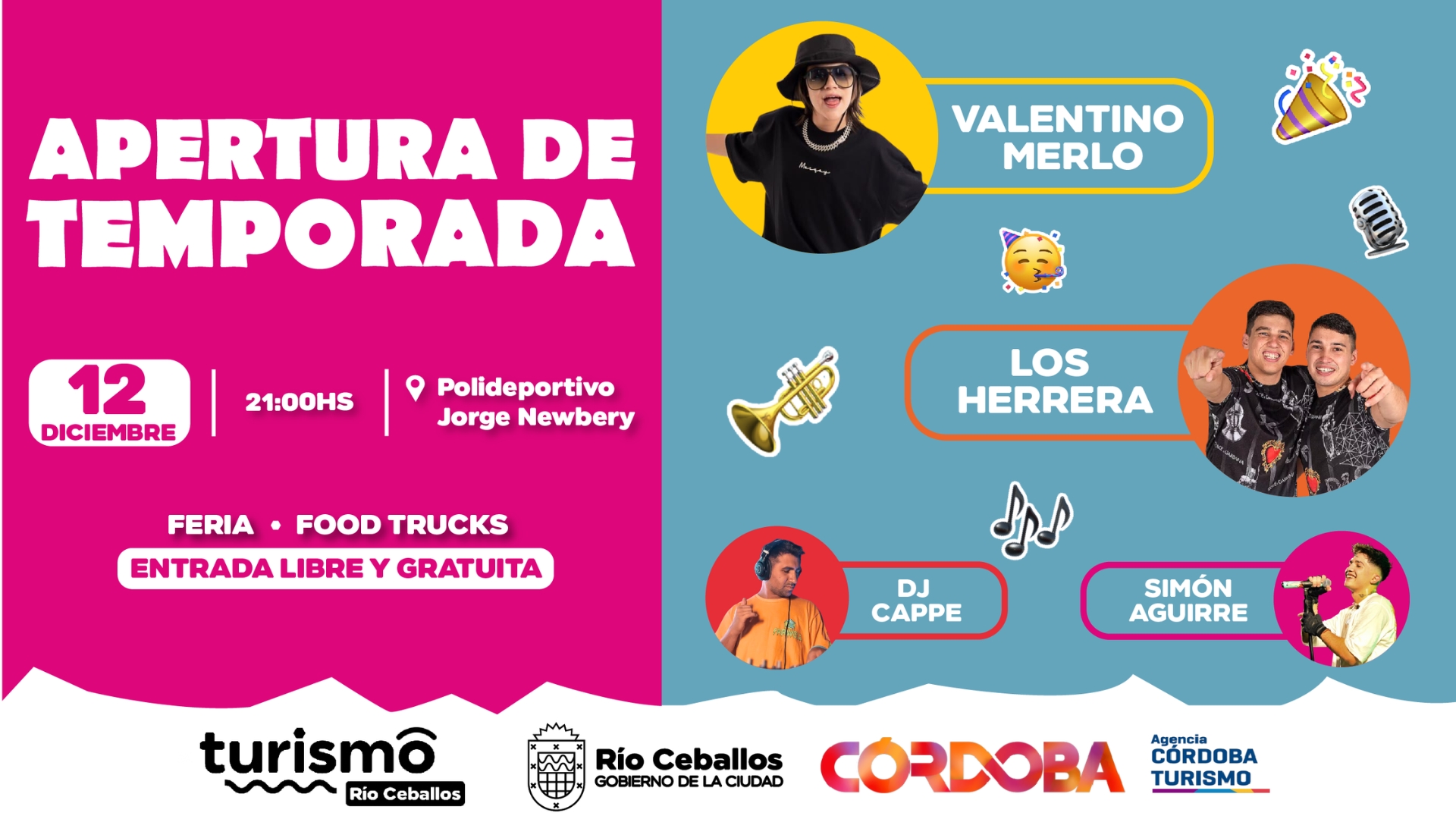 El escenario del Polideportivo Jorge Newbery será testigo de un encuentro generacional único. Simón Aguirre, referente indiscutido del tunga tunga, sumará su energía y talento con canciones como «Mi Corazón». Los cordobeses “Los Herreras” aportarán el ritmo inconfundible del cuarteto, demostrando por qué son una de las bandas más escuchadas del género, con casi 1 millón de oyentes mensuales y éxitos como «Cuidado Que Te Supero». Y para cerrar con broche de oro, Valentino Merlo, que a sus 15 años ya cuenta con más de 123 millones de reproducciones y colaboraciones junto a gigantes como Paulo Londra y Luck Ra, llegará con sus hits más recientes para encender la noche. Estos cuatro jóvenes talentos, que juntos acumulan millones de reproducciones en plataformas digitales, son sin duda algunas de las figuras más importantes y emergentes de la escena popular argentina, y Río Ceballos tendrá el privilegio de recibirlos en una noche inolvidable.